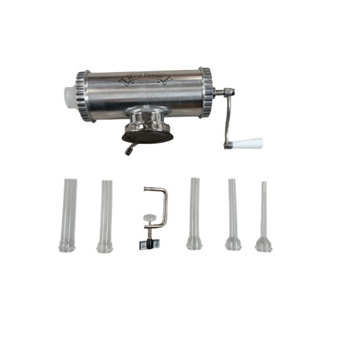 Capacitatea de 1.5 kg este ideală pentru gospodăriile care pregătesc porții moderate, iar cele 5 pâlnii incluse permit realizarea cârnaților de diferite grosimi – subțiri, medii sau groși. Manivela ergonomică face procesul de umplere mai ușor, fără efort suplimentar.